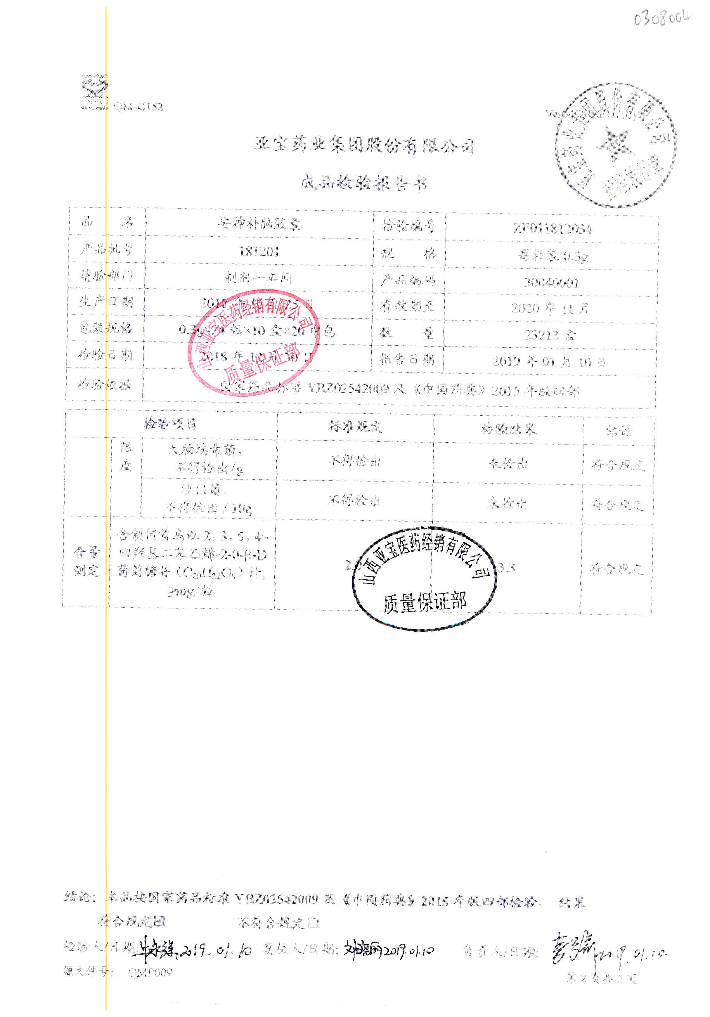 安神補腦膠囊 | 0.3g*24s | 181201(1/2) | 查看詳情 |