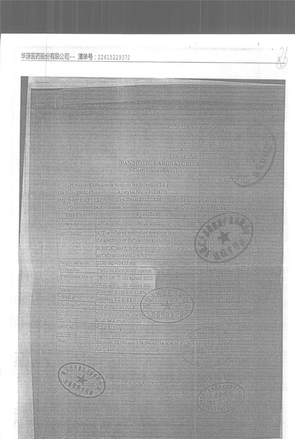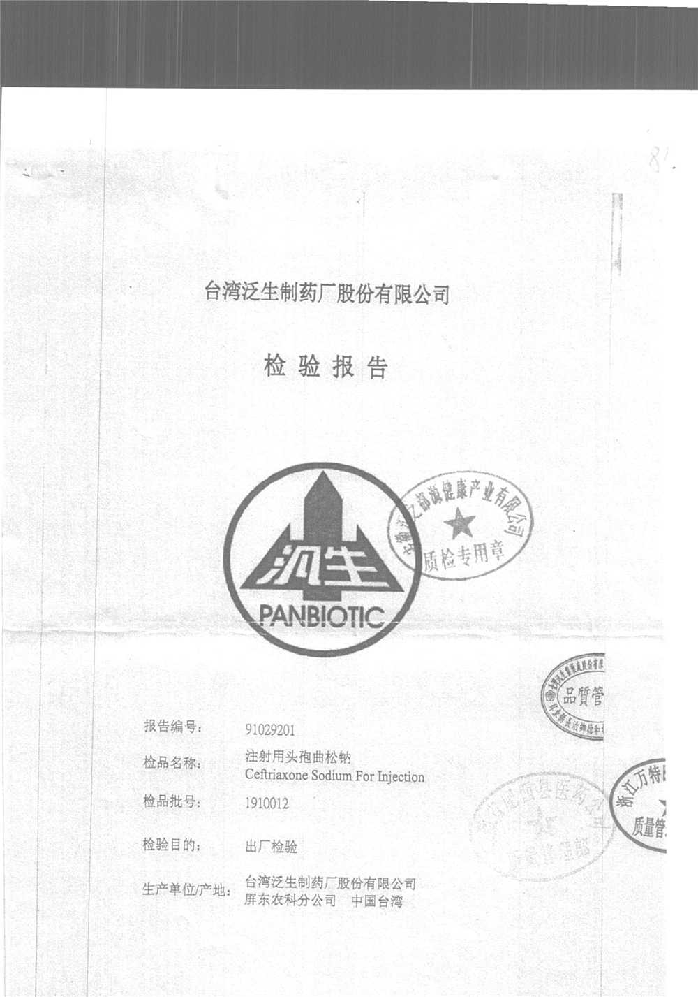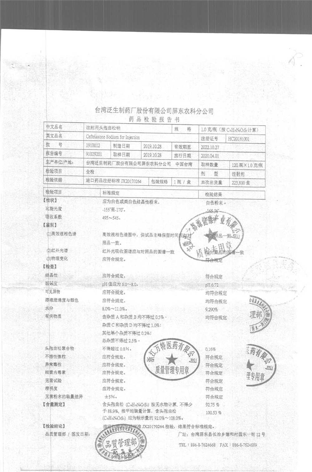 注射用頭孢曲松鈉 | 2.0g | 1903007(4/5) | 查看詳情 |