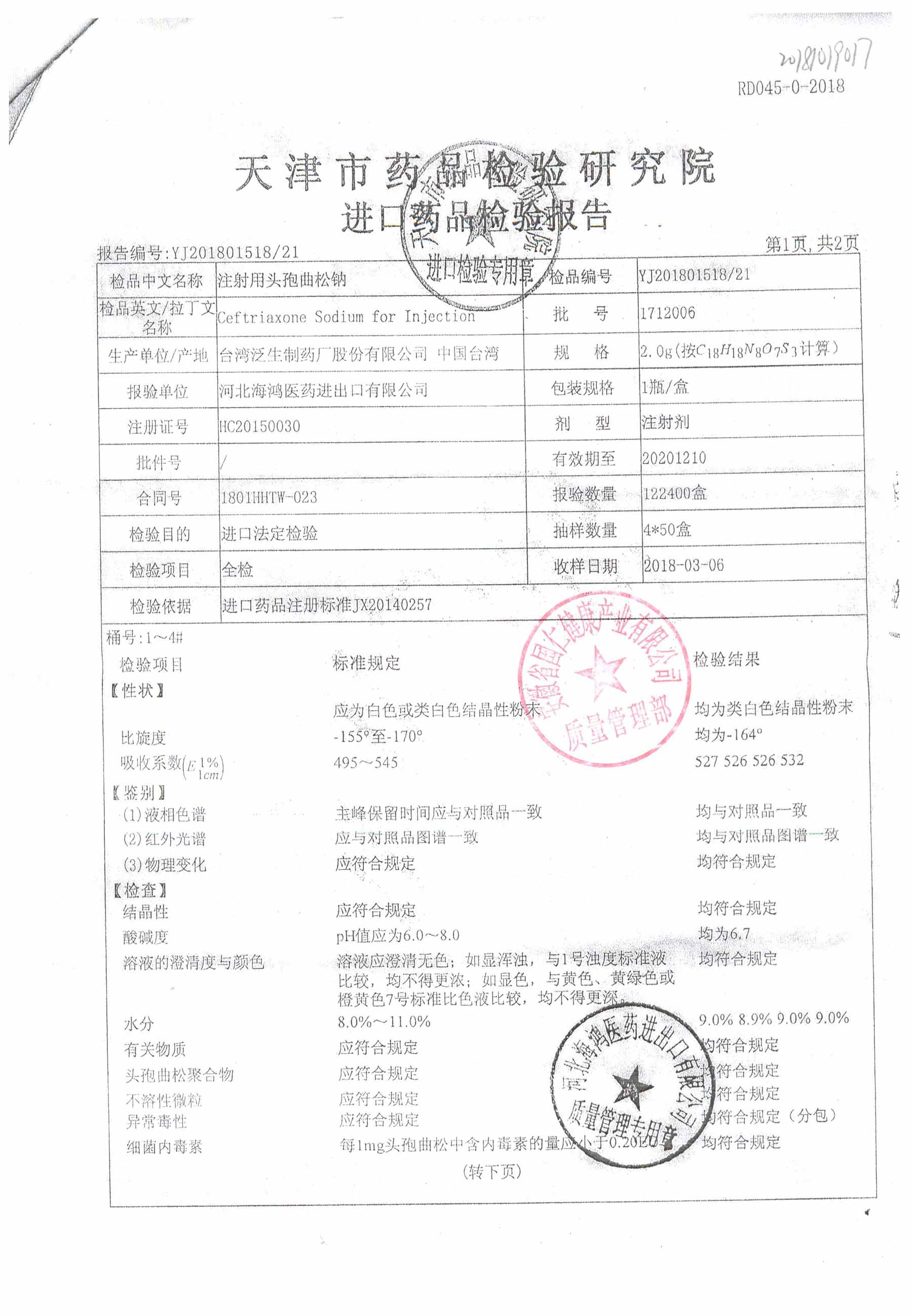 注射用頭孢曲松鈉 | 2.0g | 1801013(2/3) | 查看詳情 |