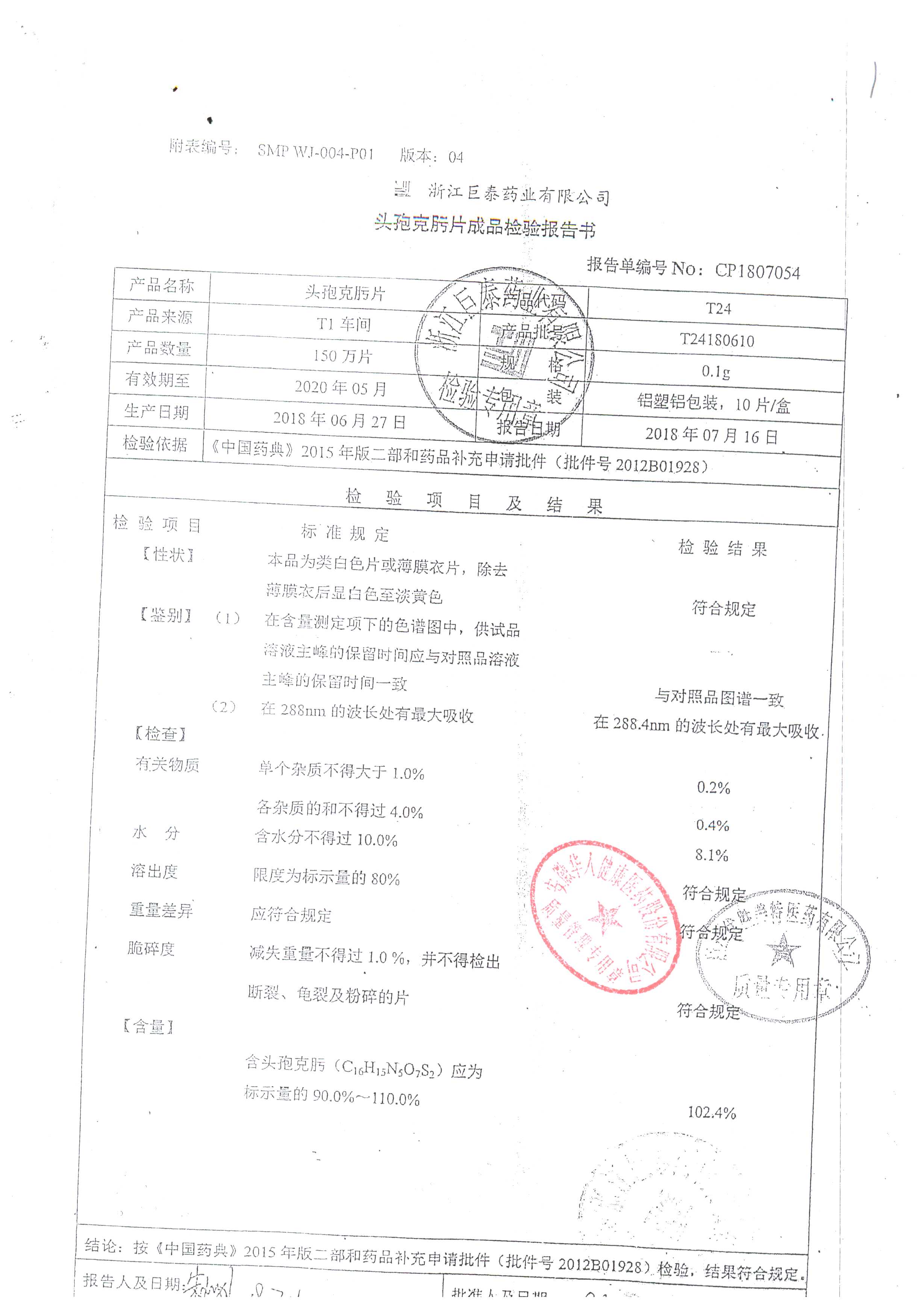 名稱 | 規(guī)格 | 批號 | 藥檢報告 |