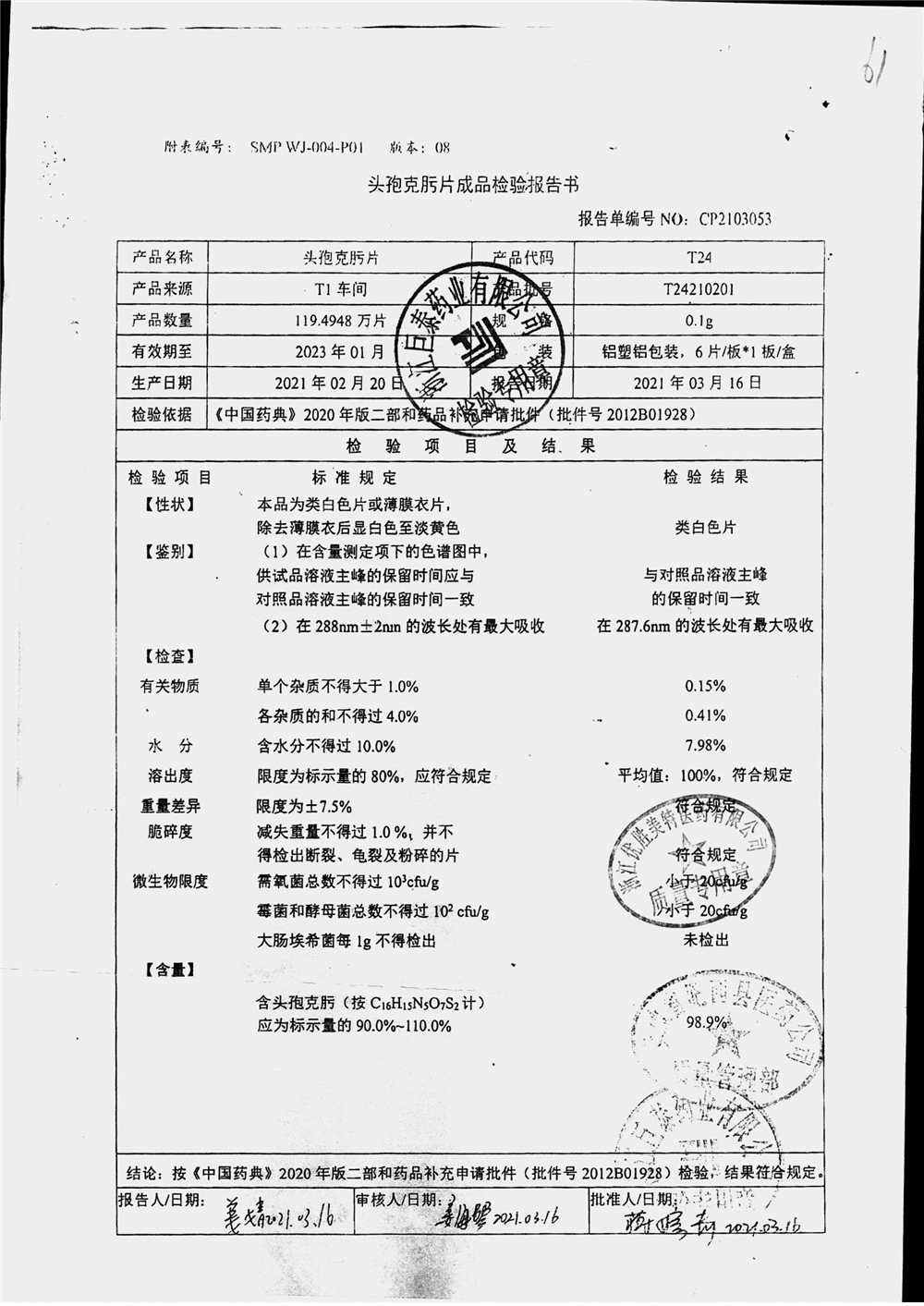 頭孢克肟片 | 0.1g*10s | T24201101 | 查看詳情 |