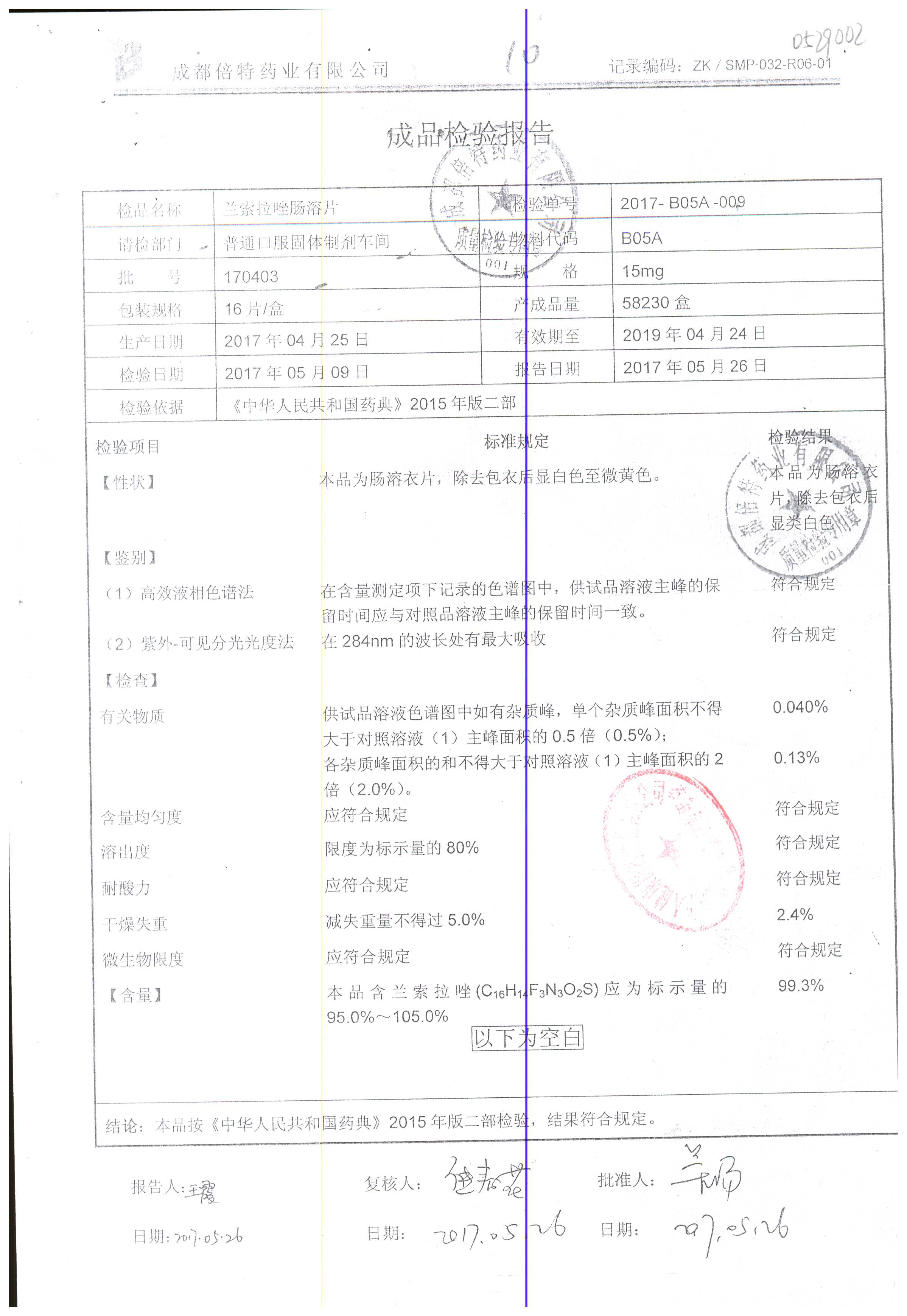 蘭索拉唑腸溶片 | 15mg*16s | 180401 | 查看詳情 |