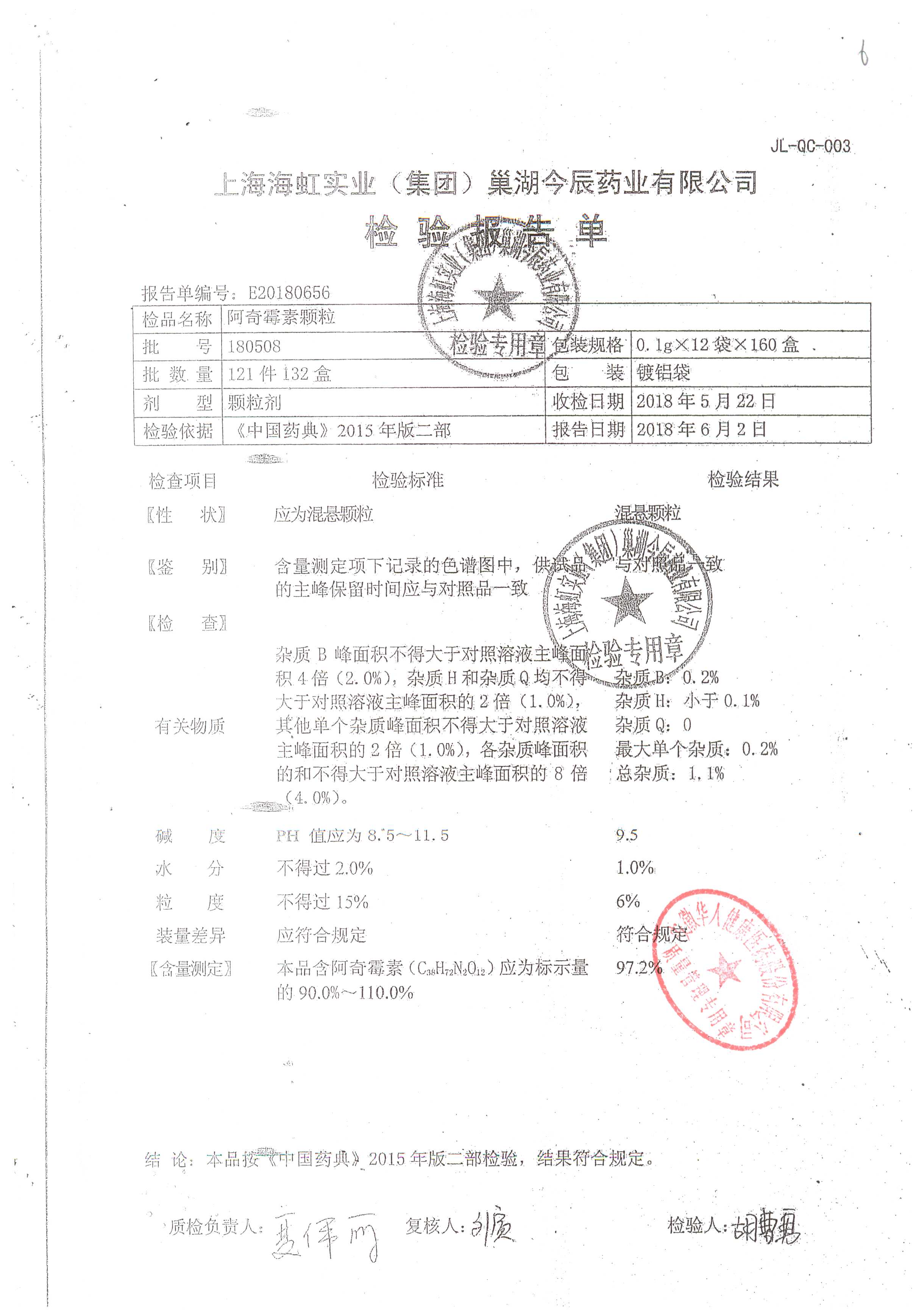 阿奇霉素顆粒 | 0.1g-12袋 | 180507 | 查看詳情 |