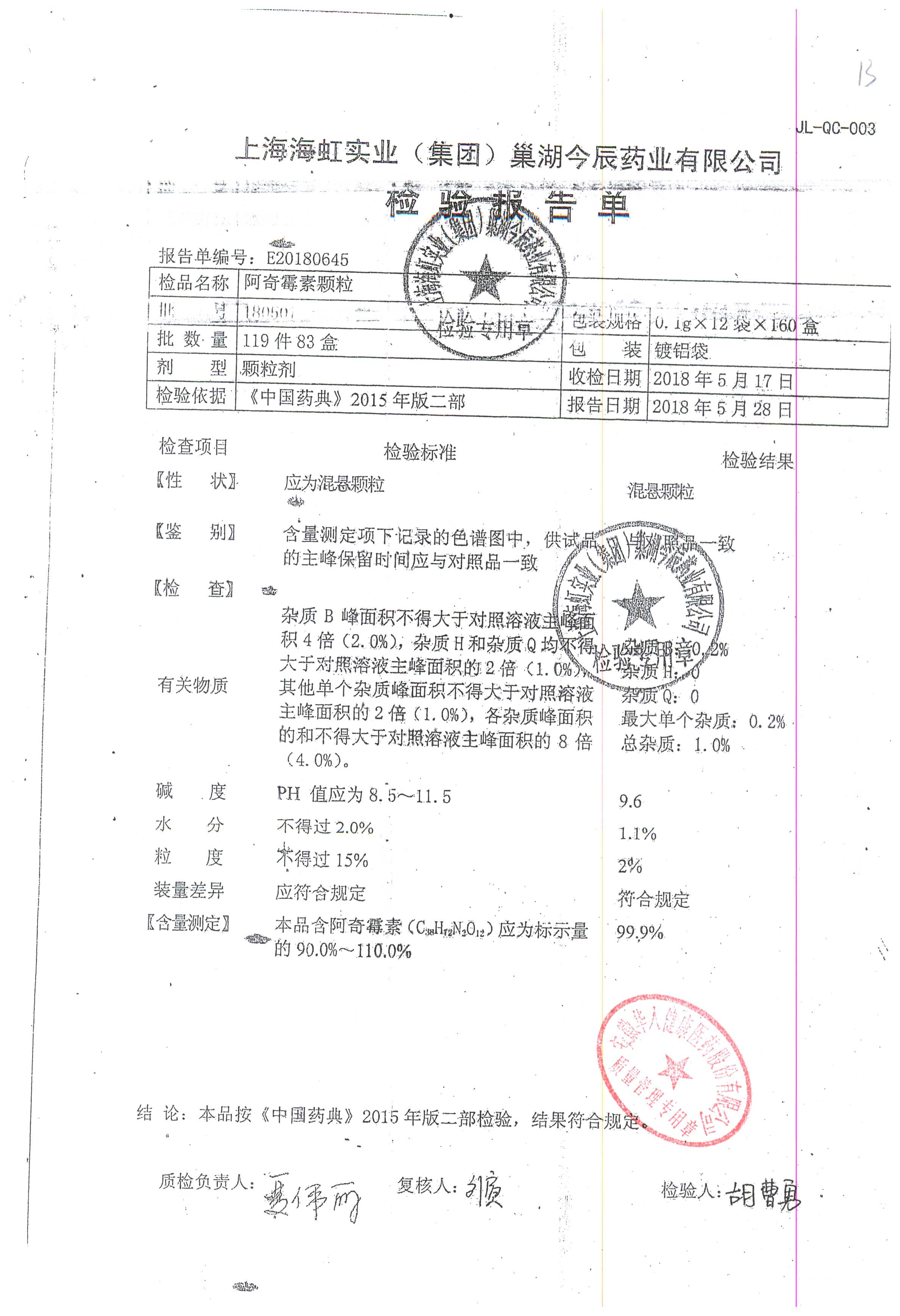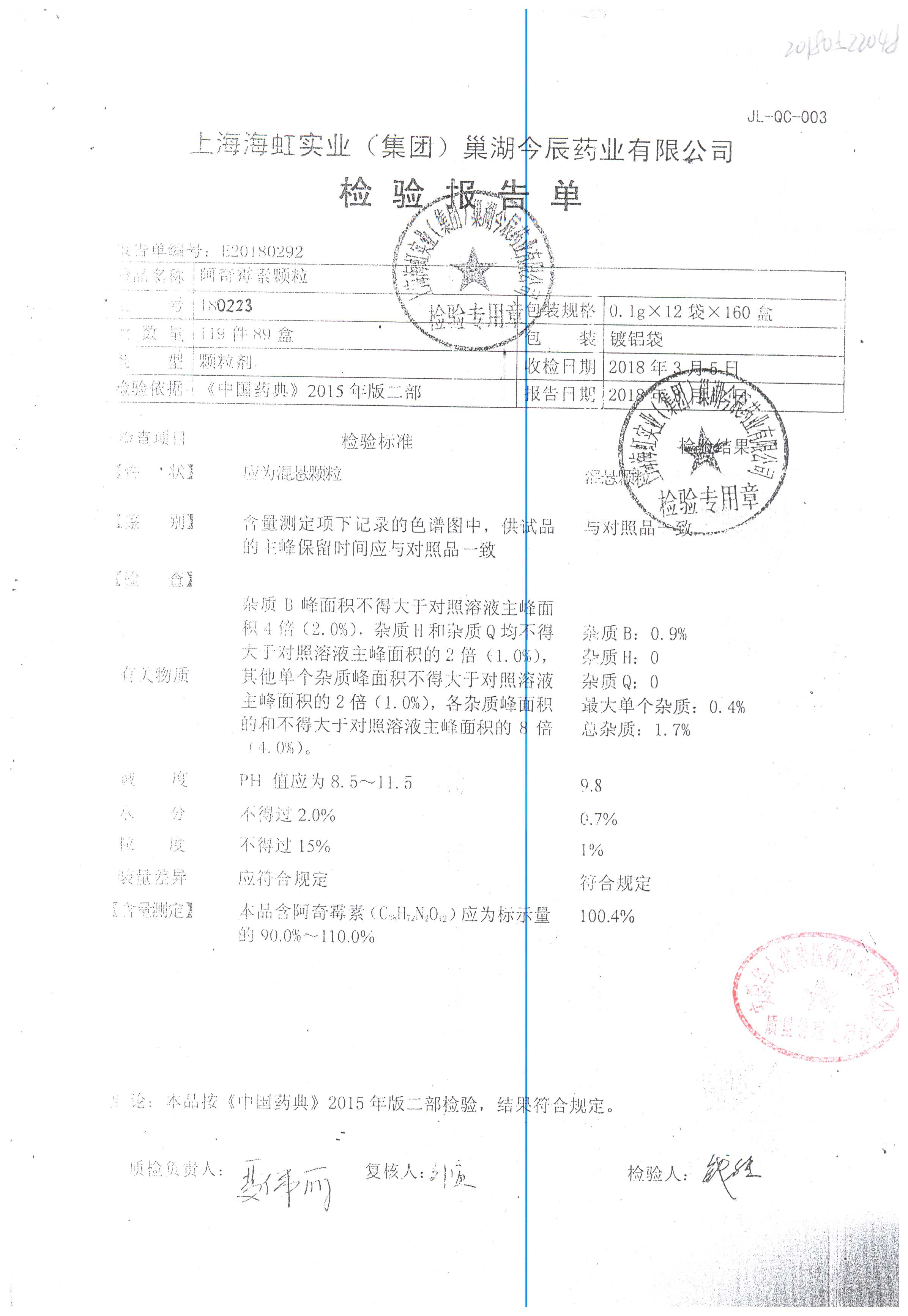 阿奇霉素顆粒 | 0.1g-12袋 | 190218 | 查看詳情 |
