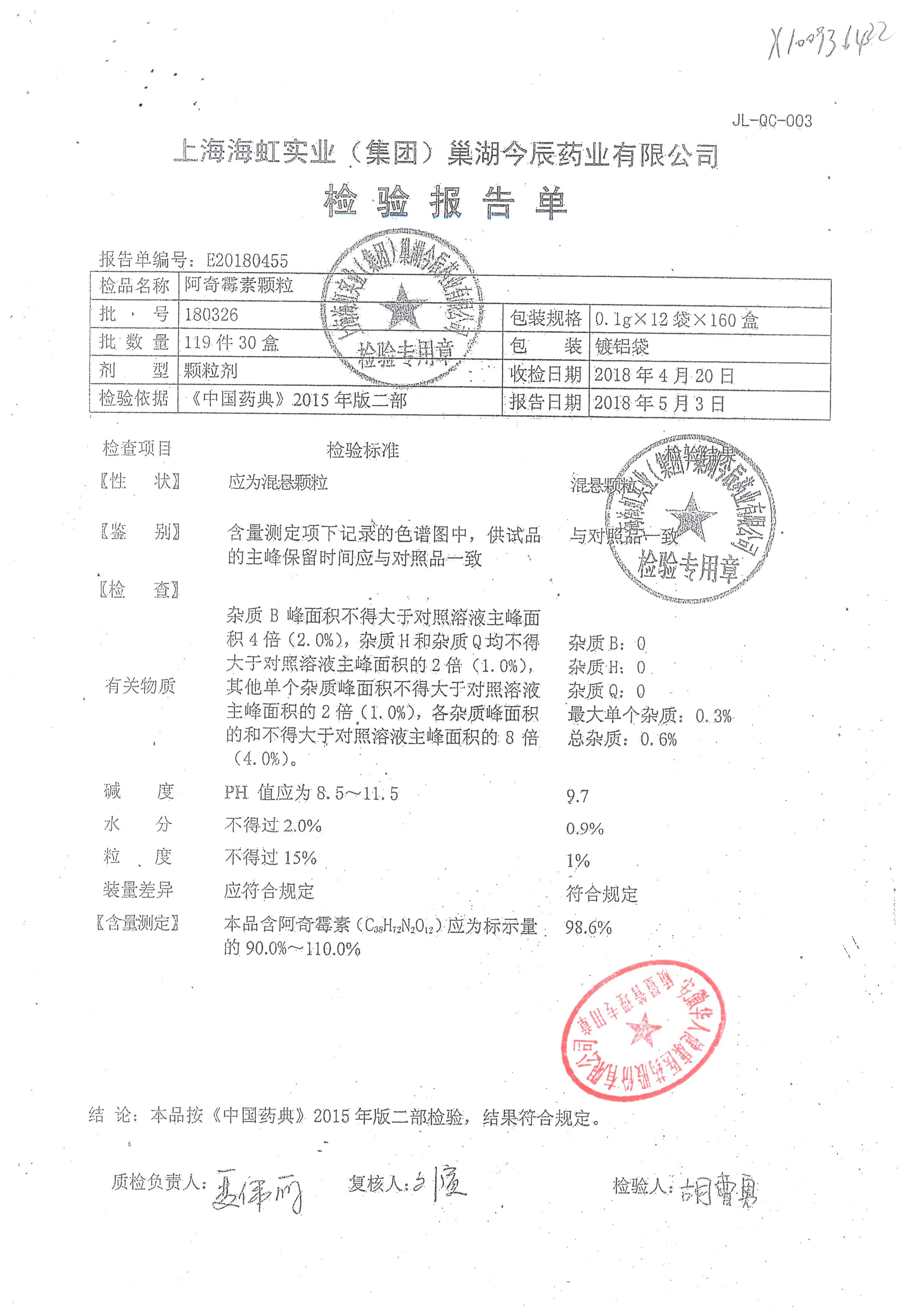 阿奇霉素顆粒 | 0.1g-12袋 | 180326 | 查看詳情 |