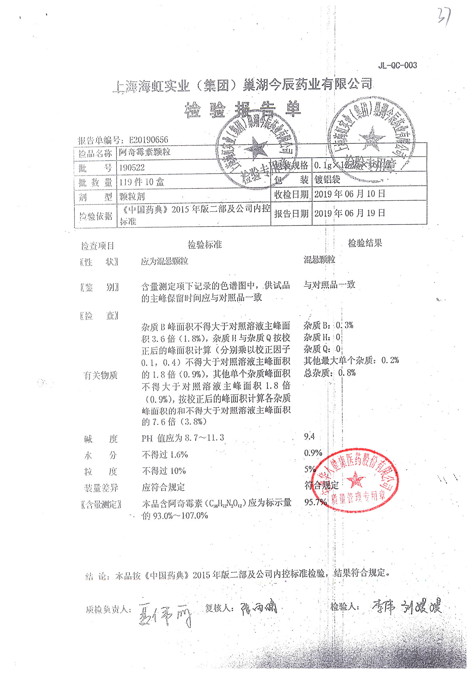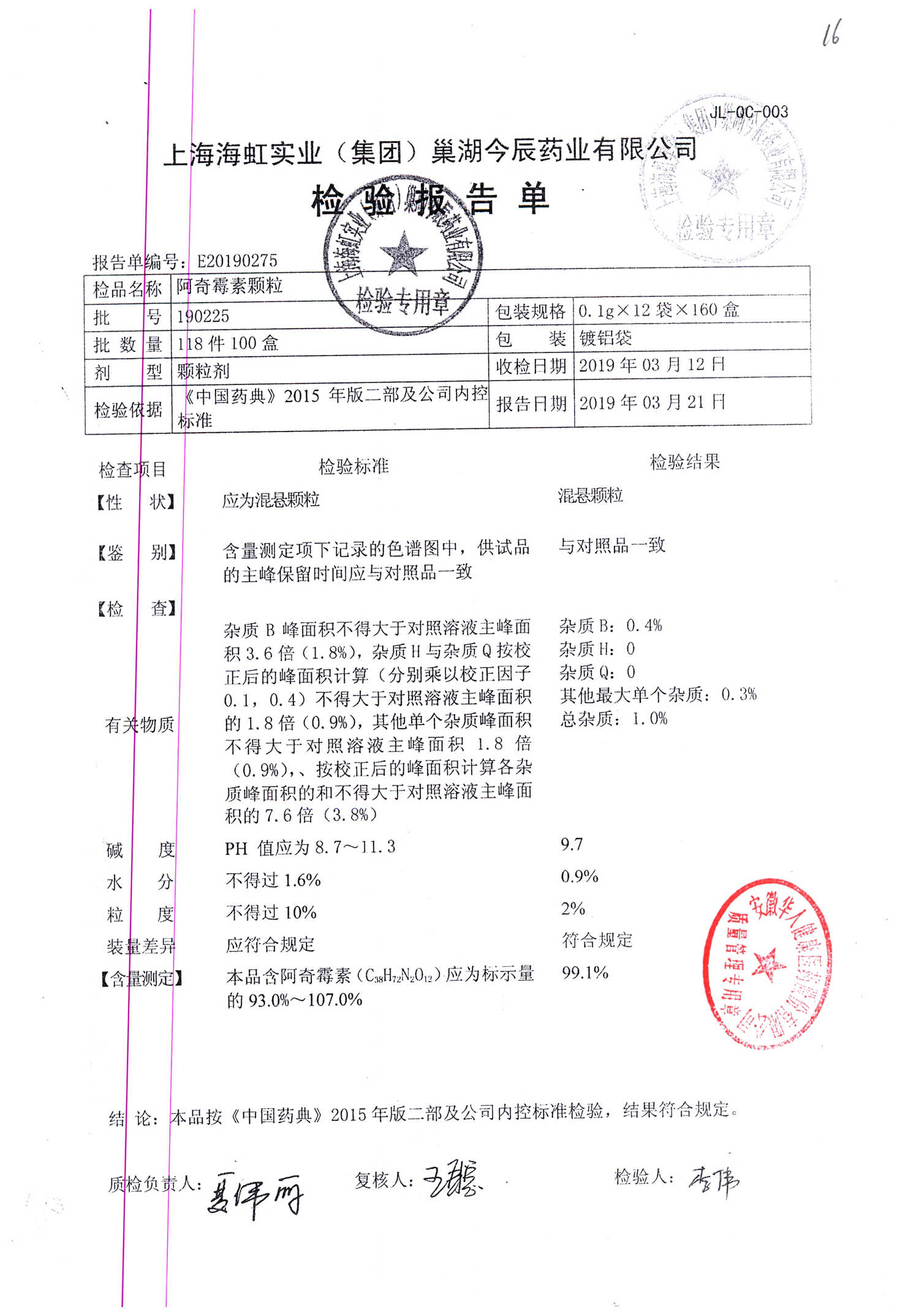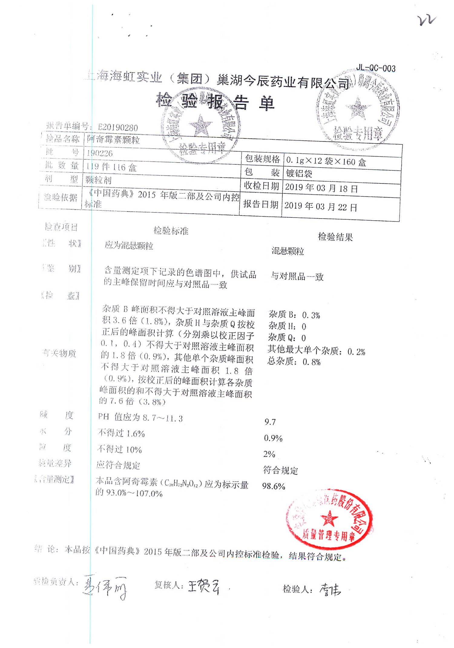 阿奇霉素顆粒 | 0.1g-12袋 | 190522 | 查看詳情 |