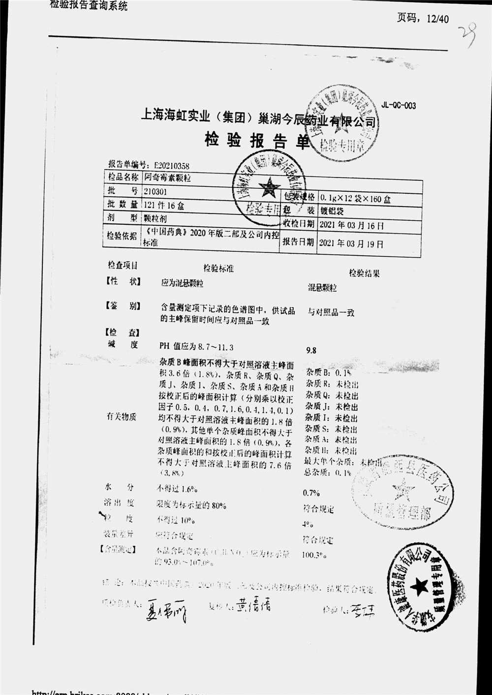 阿奇霉素顆粒 | 0.1g-12袋 | 210226 | 查看詳情 |