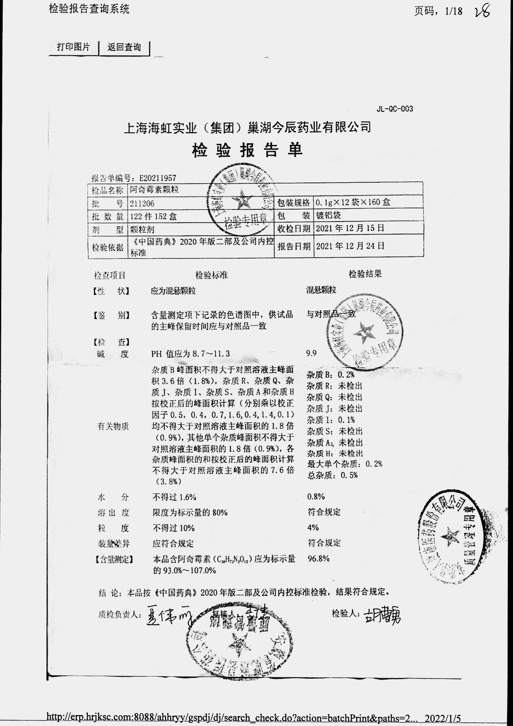 阿奇霉素顆粒 | 0.1g-12袋 | 220218 | 查看詳情 |