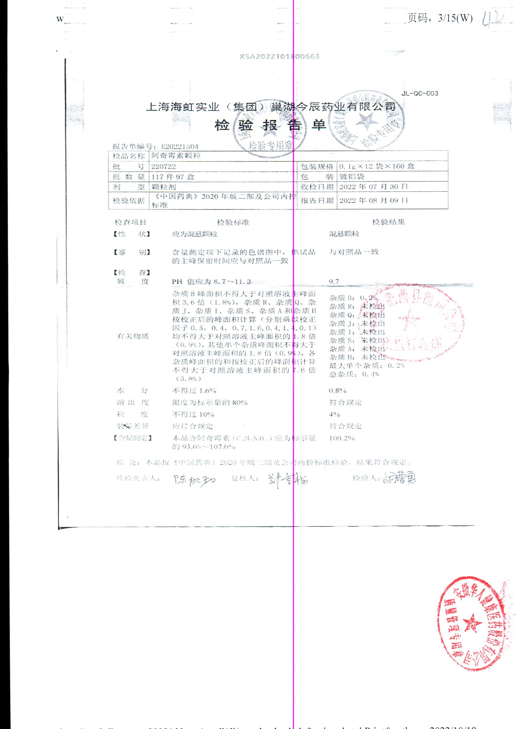 阿奇霉素顆粒 | 0.1g-12袋 | 220427 | 查看詳情 |