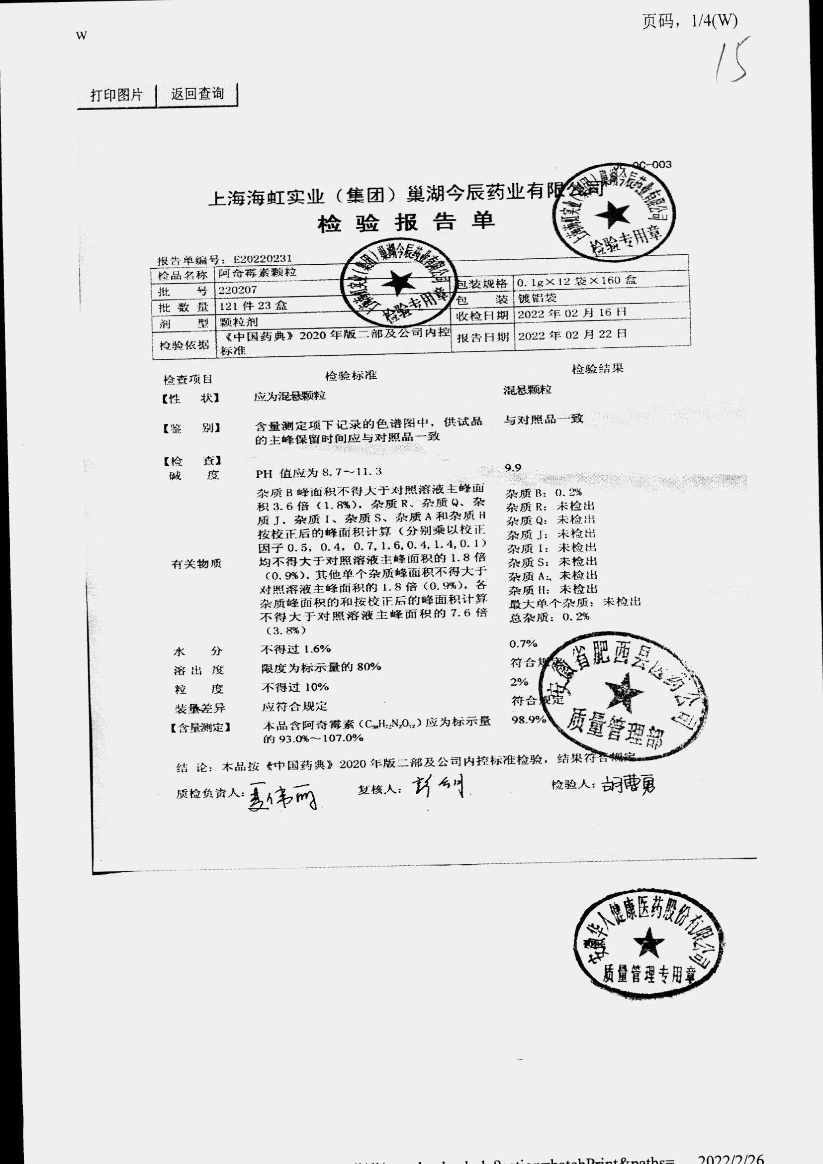 阿奇霉素顆粒 | 0.1g-12袋 | 220207 | 查看詳情 |