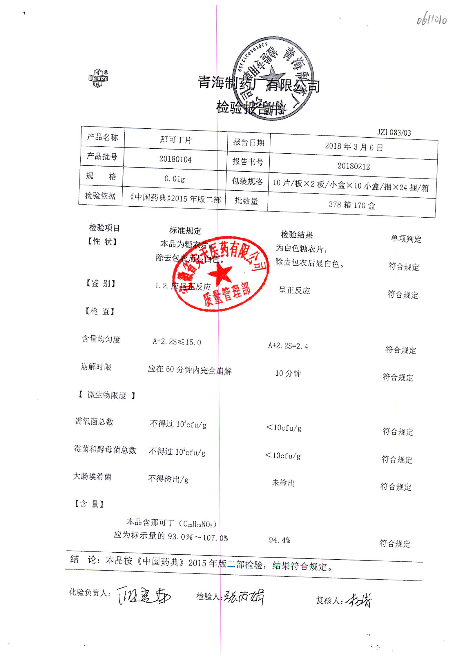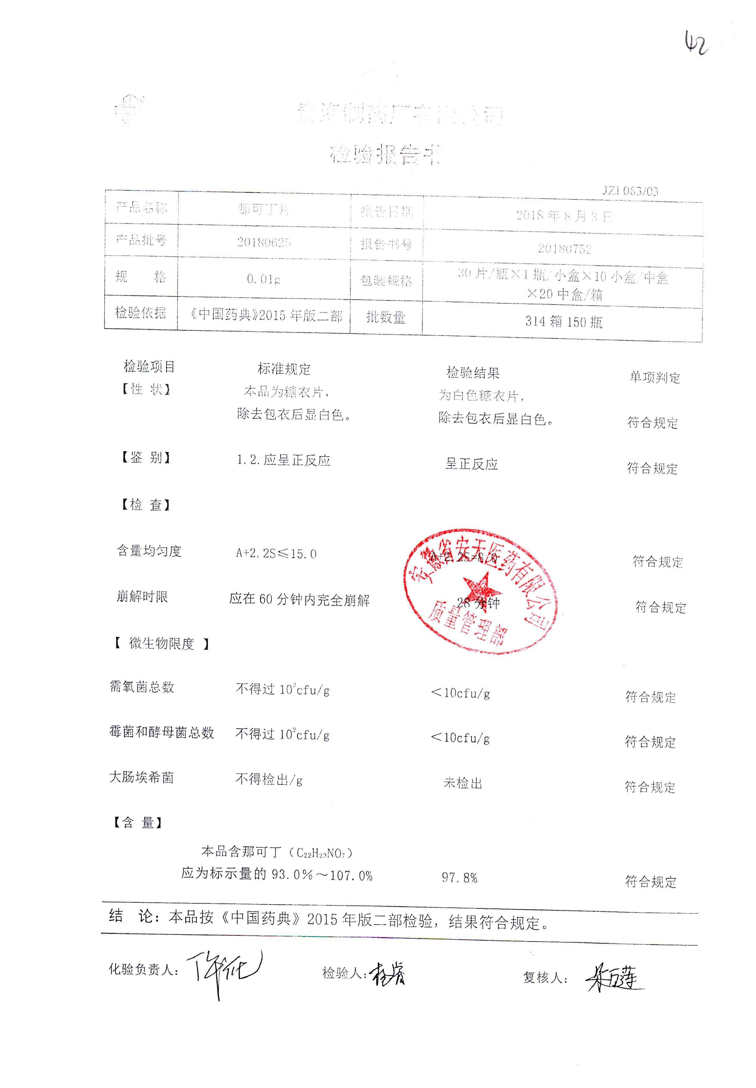 那可丁片 | 0.01g | 20180104 | 查看詳情 |