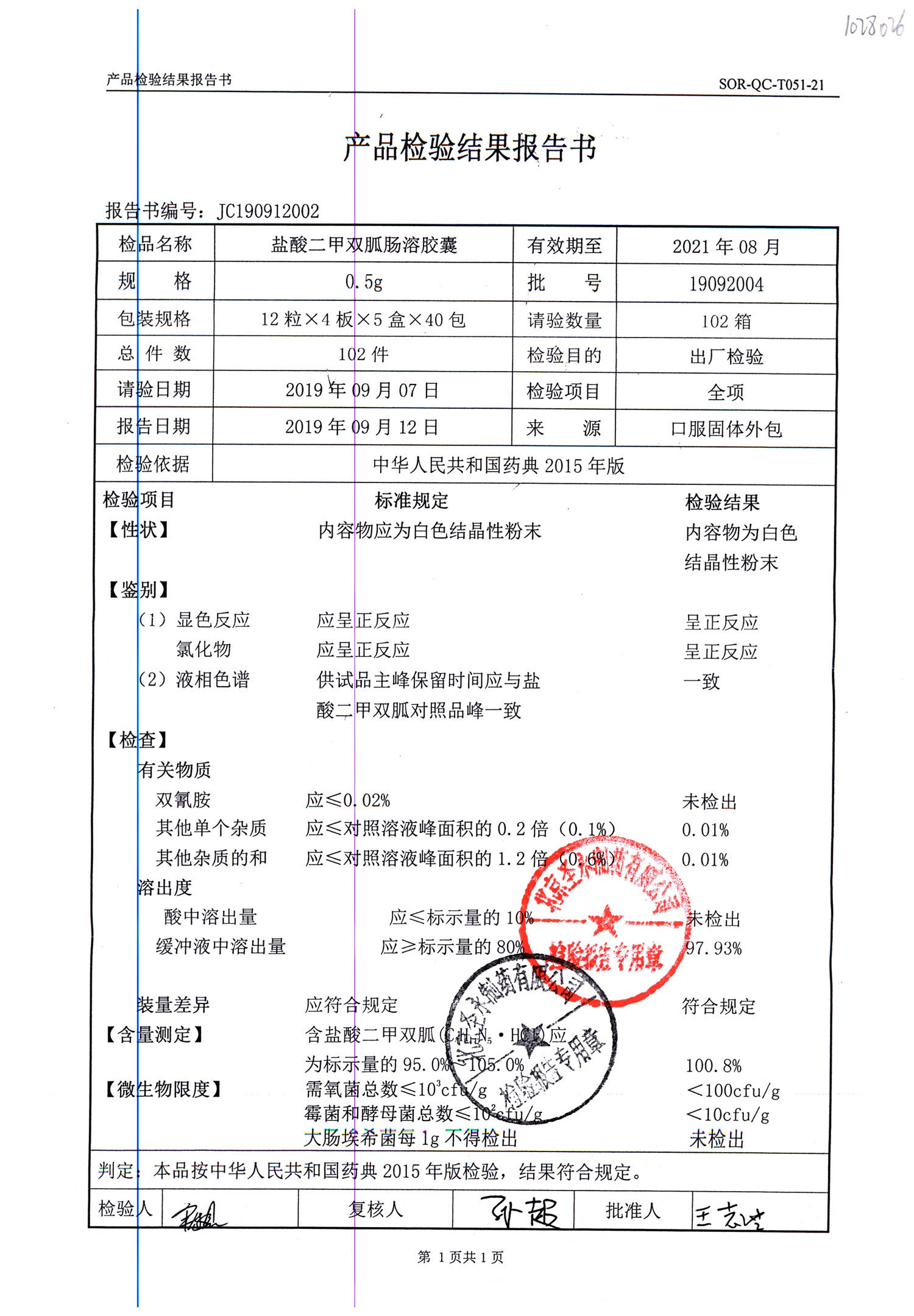 鹽酸二甲雙胍腸溶膠囊 | 0.5g*48s | 19092031(2/2) | 查看詳情 |