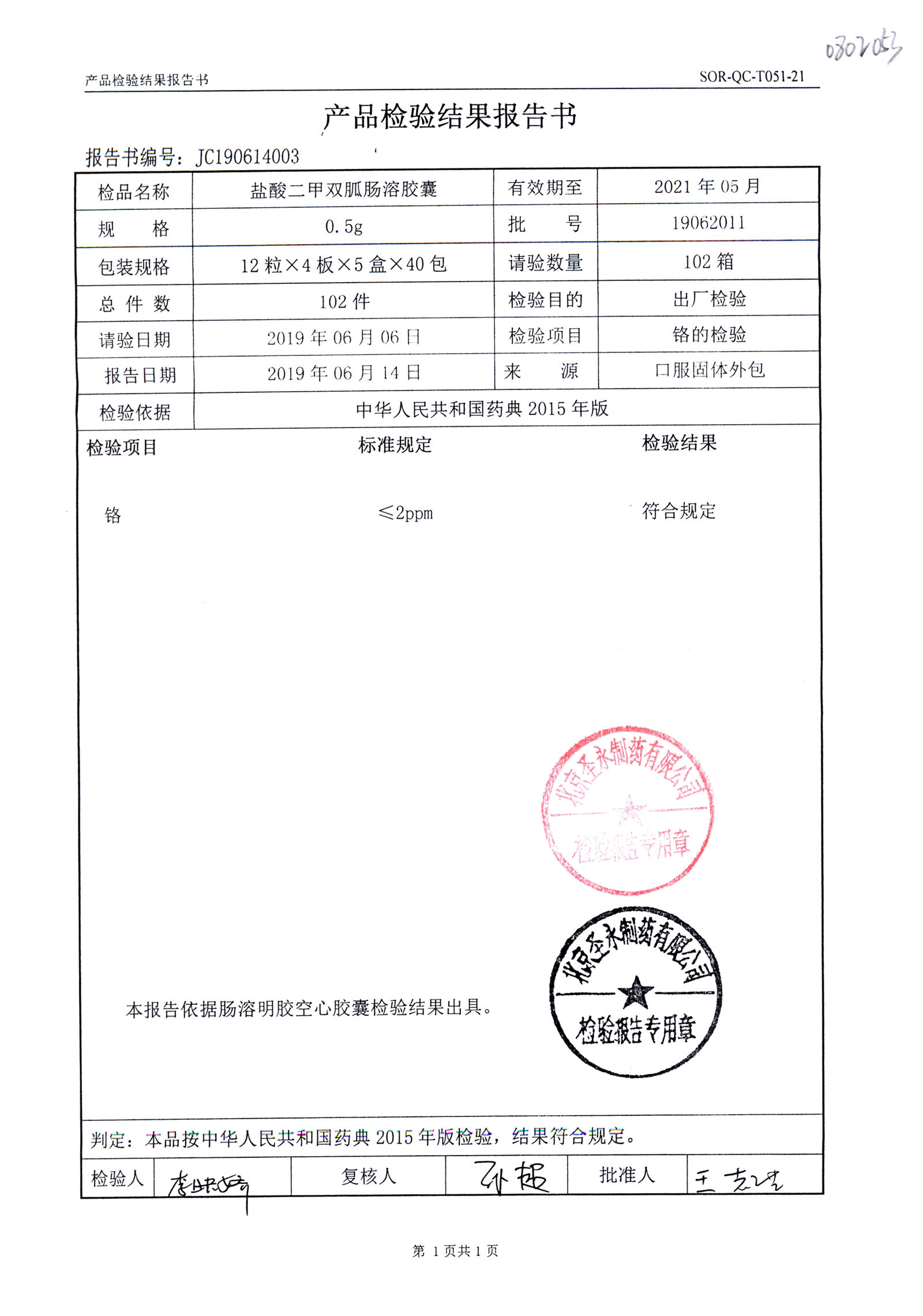 鹽酸二甲雙胍腸溶膠囊 | 0.5g*48s | 19062011(2/2) | 查看詳情 |